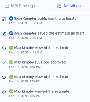 Sous Activities (Activités), Kimoby conserve un historique de toutes les actions effectuées dans l’estimation, y compris la consultation de celle-ci. Vous pouvez donc voir précisément quelles actions ont été prises, par quel utilisateur et à quel moment.